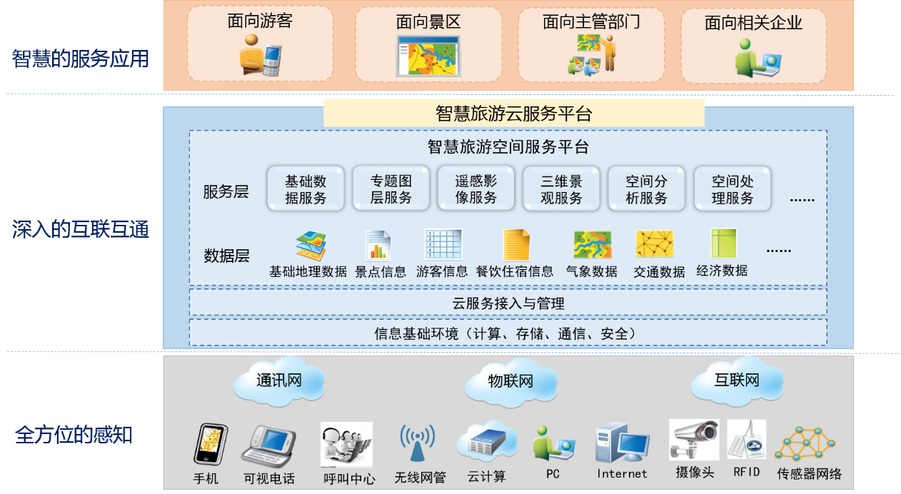 智能化的空間服務(wù):提供多樣化的空間信息服務(wù)和運維管理,從在線到離線,從數(shù)據(jù)服務(wù)到功能服務(wù),從私有云到公有云環(huán)境,并支持多終端多應(yīng)用模式的開發(fā)方式,以滿足游客、景區(qū)、旅游主管部門和相關(guān)企業(yè)的應(yīng)用需求。